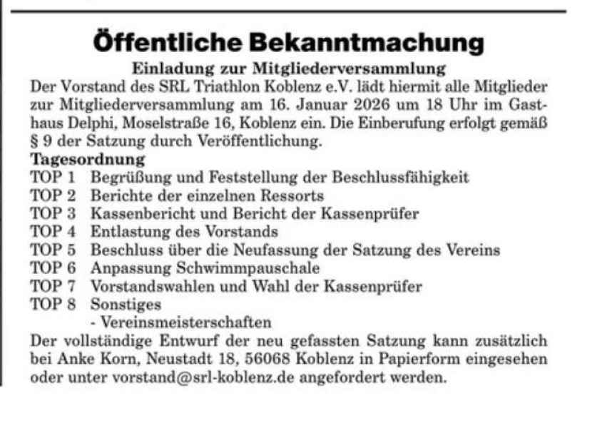 Der Vorstand des SRL Triathlon Koblenz e.V. lädt hiermit alle Mitglieder zur Mitgliederversammlung am 16. Januar 2026 um 18 Uhr im Gasthaus Delphi, Moselstraße 16, Koblenz ein.